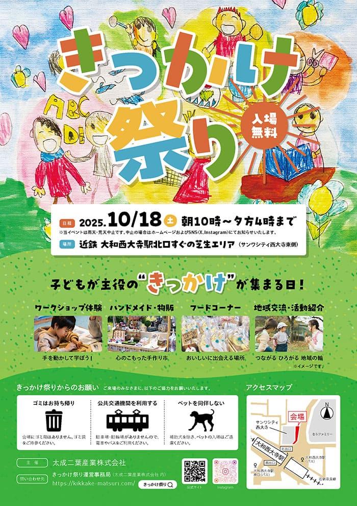10月18日(土)、大和西大寺駅北口すぐの「サンワシティ西大寺前芝生広場」にて、親子で楽しめる体験型イベント『きっかけ祭り2025』が開催されます。