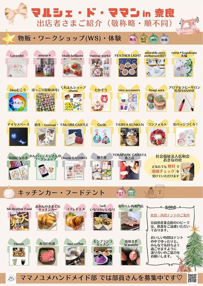 2025.11.13 yuzu 奈良&大阪 同時開催マルシェマルシェ・ド・ママン in 奈良 11月15日(土)、奈良県産業会館・JR高田駅東側広場にて開催! 本イベントは大阪会場と同時開催です。 テーマは「~価値を認め幸せの共有~」! 作り手さんの想いが詰まった一点ものや温かい交流をお楽しみください♪ 【 奈良会場の楽しみ方 】 素敵なハンドメイド作品との出会い 親子で楽しめるワークショップ キッチンカー&フードテントで美味しい休憩 皆んなで描く幸せメッセージアート スタンプラリーで素敵な景品をGET!(なくなり次第終了) 大阪会場と繋ぐインスタライブで各地の魅力をご紹介! 【 イベント詳細 】 開催日時|11月15日(土) 10:00〜15:00 場 所|奈良県産業会館・JR高田駅東側広場 ※入場無料 / 雨天決行・荒天中止 詳しくはこちらから