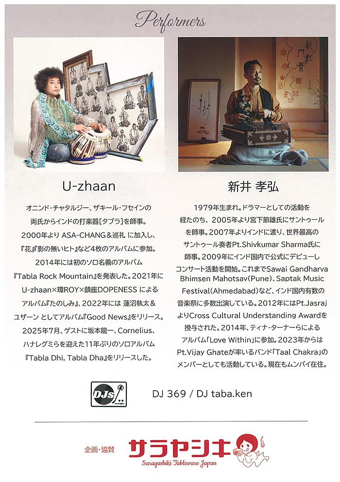 今回はタブラ奏者 U-zhaan(ユザーン)とサントゥール奏者 新井孝弘、国内外の第一線で活躍するふたりのスペシャリストによる豪華セッション。静と動が織りなす極上の音色を全身でご体感ください。事前予約限定でインドのお粥「キチュリ」プレート(+1,100円)もお愉しみいただけます。