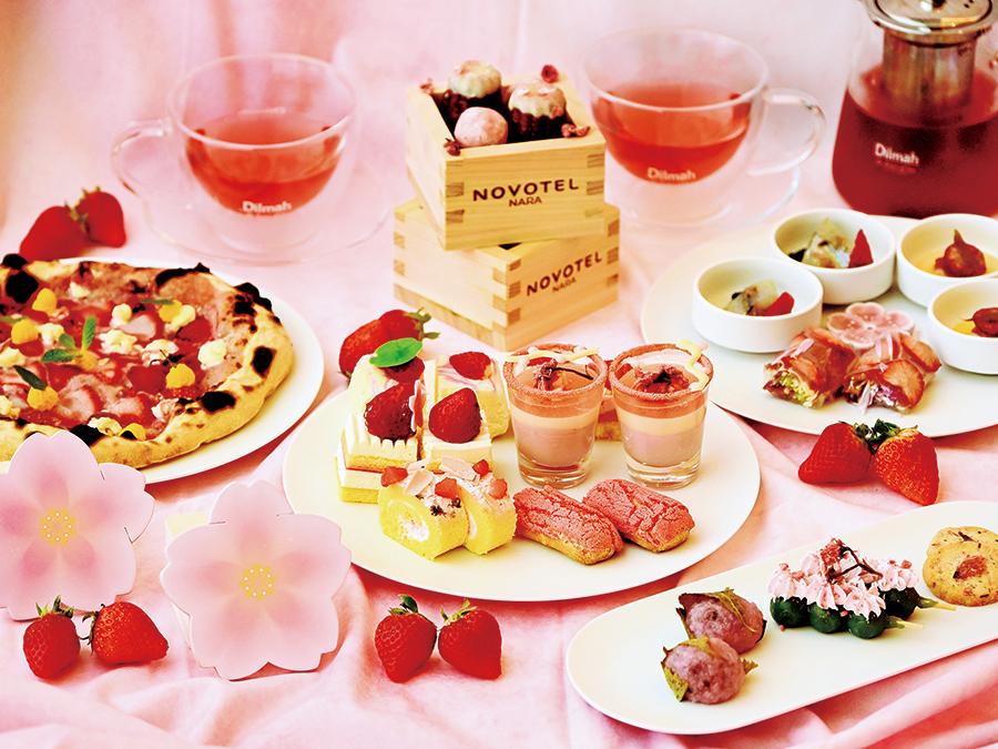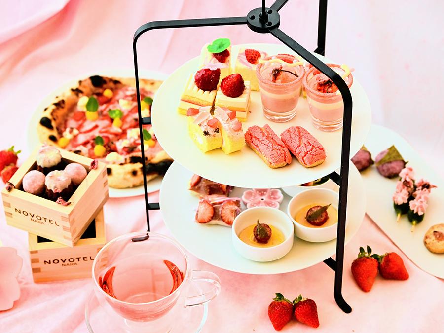 桜の名所・佐保川沿いのラウンジに、古都華を主役に桜の香りをまとった和洋のスイーツやセイボリー16種が勢揃い。植村牧場製リコッタチーズを使い、奈良の恵みを一皿に凝縮したピザは今季限定のおすすめです。