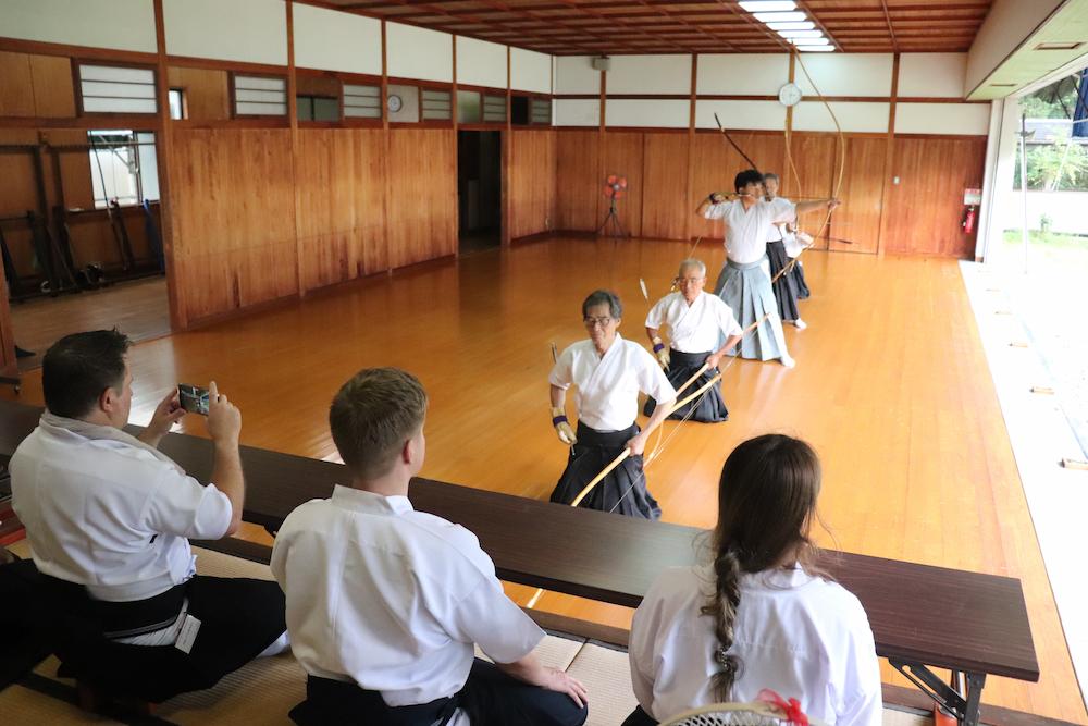 間近で見る本物の弓道を静かに見守る参加者の皆さん。スマートフォンを手に、様子を動画に収める方もいました。