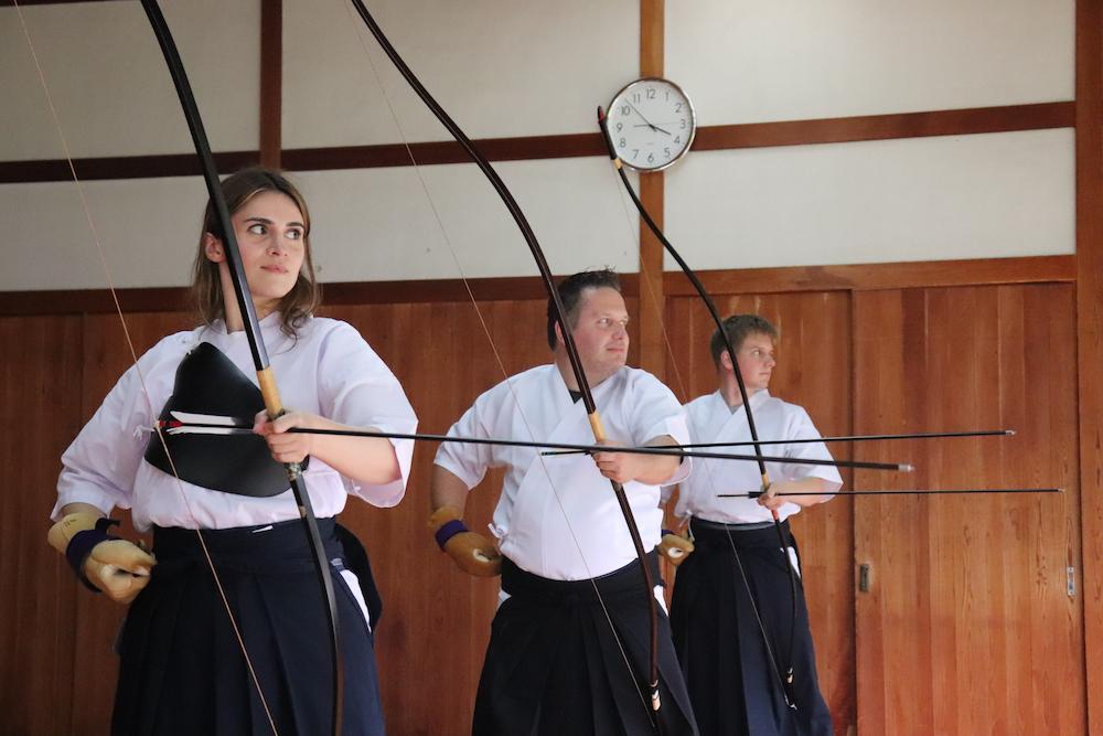 体験は4月~6月、9月~11月の月・水・金曜に開催。道着袴に着替え高段者によるマンツーマン指導のもと、弓道の基礎や所作を学び、最終的に一人で的に向かって矢を射るまでを体験します。