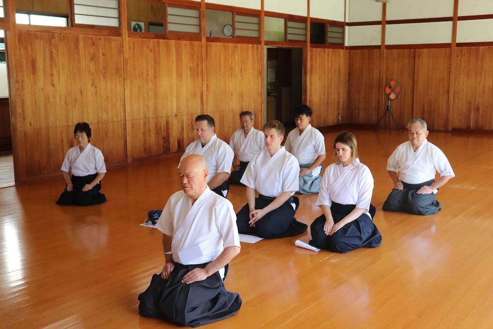 弓道着に着替えたら、まずは射場内で黙想の時間。呼吸を整え、心を落ち着かせることから弓道体験は始まります。
