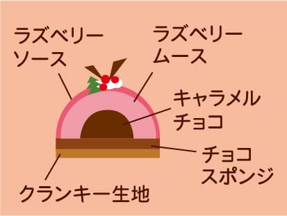 鮮やかな赤が目を引く『ラズベリーショコラ』。中はザクザク食感のクランキー生地にチョコスポンジをのせ、キャラメルチョコを甘酸っぱいラズベリームースで包む。艶のあるラズベリーソースのコーティングで、かわいくクリスマスを演出♪