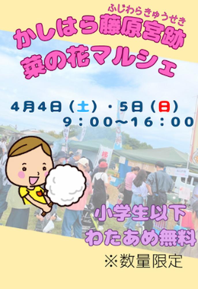 2026.2.28 鮎 【桜】藤原宮跡(橿原市) ●ふじわらきゅうせき 撮影:@narashika_jijii さん 見頃…3月下旬~4月上旬 *見頃は気象状況によって変動します 694年から16年間、日本の首都であった「藤原京」。その中枢部の遺跡「藤原宮跡」では広大な敷地をいくつかのゾーンに分け、春から秋にかけて季節の花々が楽しめます。 「春ゾーン」では例年3月下旬ごろから桜と菜の花がそろって見頃を迎えます。醍醐池の土手に連なる桜並木と池の北一面に広がる約140万本の菜の花畑、春色のコントラストが美しい絶景が目の前に広がります。 東には三輪山や大和高原の山々、北には耳成山とJR線、西には畝傍山・葛城連山が見え、360度それぞれに特徴のある背景が広がっているのも魅力です。散策しながら撮影を楽しむのもよし、土手に座ってのんびりお花見もいいですね♪ 撮影:@narashika_jijii さん 撮影:@s____y03さん 【 かしはら藤原宮跡 菜の花マルシェ 】 開催期間 2026年4月4日(土)・5日(日) 時 間 9:00~16:00 会 場 藤原宮跡 醍醐池北西側 [関連記事] 【橿原市】藤原宮跡 日本初の都!! 詳細を見る≫