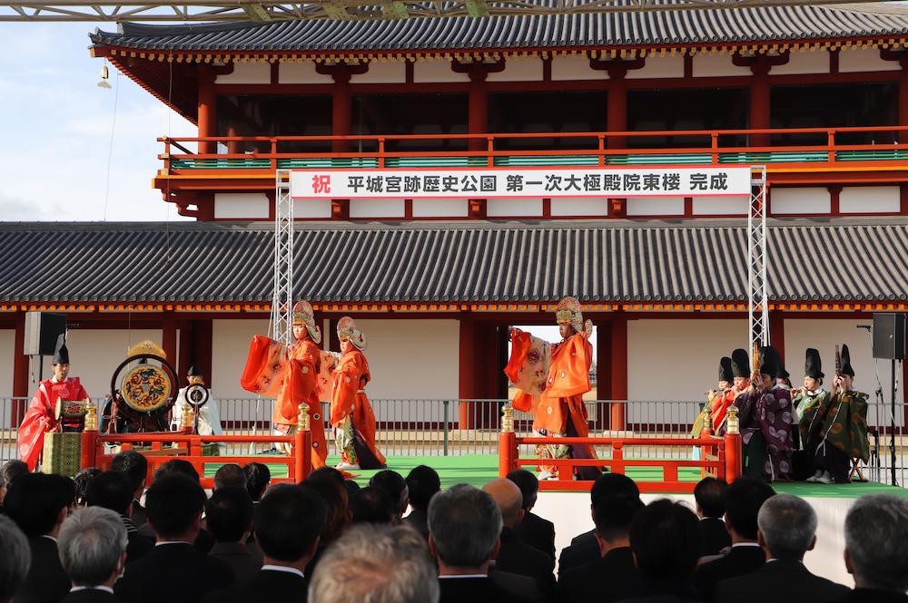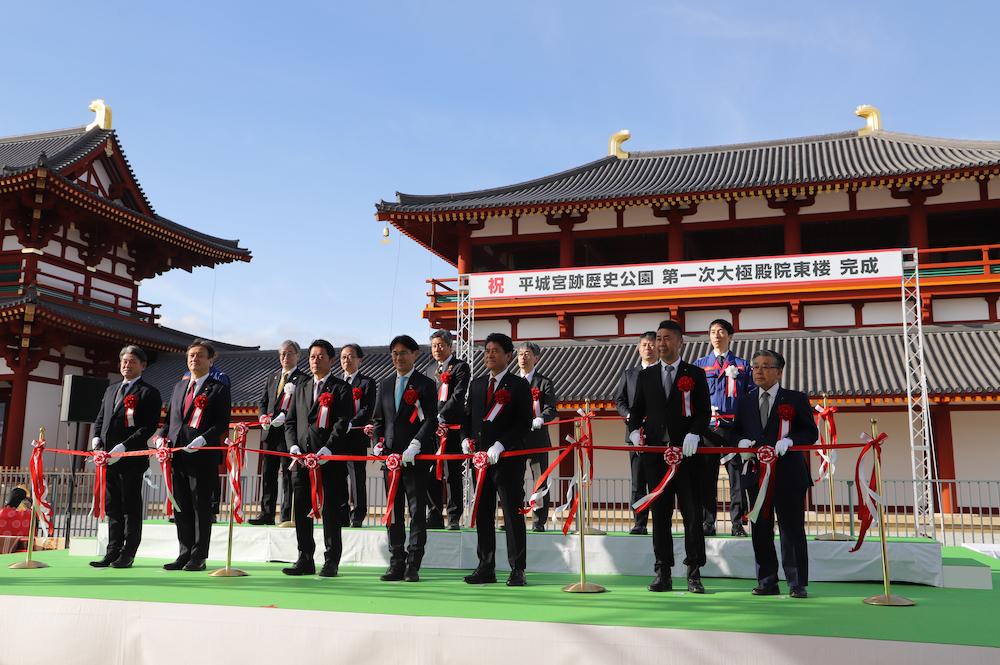 〈奈良市〉世界遺産 平城宮跡で「東楼」完成披露 2026.3.24 鮎 高さ約18mの「東楼」が復元整備されました 奈良市の世界遺産 平城宮跡で、第1次大極殿院の大極門の東に建つ高さ約18mの「東楼」が復元され、3月14日に完成式典が開かれました。 第1次大極殿院は奈良時代前期の平城宮の中枢施設で、東楼は730年頃に同院の南門(大極門)の傍らに西楼と共に建てられたとみられています。 『続日本紀』によると、天平8年(736)正月に聖武天皇が群臣らと「南楼」で宴を催したといい、この南楼が大極門の東西で見つかった楼閣を指す可能性があるそう。 復元された東楼には当時と同じ国産ヒノキを使用し、槍鉋(やりがんな)などの伝統工具も活用されました。3月15日から大極門とともに一般公開され(9時~17時)、今後は東楼から続く回廊、西楼と整備が進められていく予定です。 天理大学雅楽部による舞楽の披露