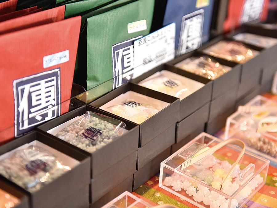 ある、甘味素材のお店、その名も「砂糖傳 増尾商店」。懐かしい水飴「御門米飴」や金平糖の「奈良こんふぇいと」、「奈良はちみつ」、「黒砂糖」など、添加物なしの素朴な甘味が置かれています。