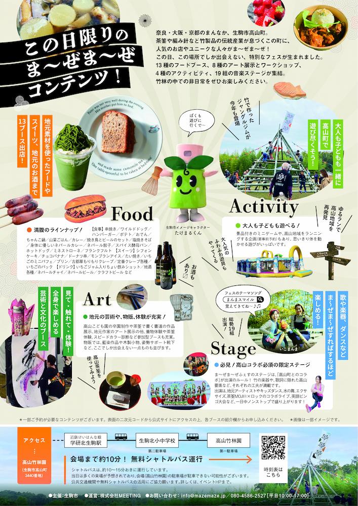 〈生駒市〉日本一の茶筌のまちで「高山ま~ぜま~ぜふぇす」開催(3/14) 2026.3.12 鮎 竹製遊具や茶筌書道、ご当地グルメで伝統と今が混ざり合う! 伝統工芸品「高山茶筌」で知られる奈良県生駒市高山町の高山竹林園で、高山の歴史や文化的な魅力を生かしたイベント「高山ま~ぜま~ぜふぇす」が2026年3月14日(土)に開催されます。 「高山ま~ぜま~ぜふぇす」は、高山町の地域活性を目的として2024年に誕生したイベントで、今回が2回目の開催。アートやアクティビティ、フード、ステージなど、さまざまなジャンルが混ざり合い、新しい魅力を生み出します。 昨年の様子 出店コンテンツは高山町の竹や野菜、伝統工芸などの資源や魅力がコラボレーション。フードでは、地元産の食材を使った料理やドリンク、奈良先端科学技術大学院大学とのコラボ商品が提供されます。 また竹のジャングルジムや遊び場、町内ランニングといったアクティビティに、町内外のアーティストによるアート展示やステージ披露、茶筌を知るワークショップなども実施されます。 高山町産の食材を使ったフード大きな竹を使ったジャングルジム茶筌の端材を使った茶筌書道 会場の高山竹林園へは、近鉄学研北生駒駅からの無料シャトルバスも運行。大人も子どもも楽しみながら茶筌のまちの魅力を味わえる1日です♪ イベント詳細はコチラ