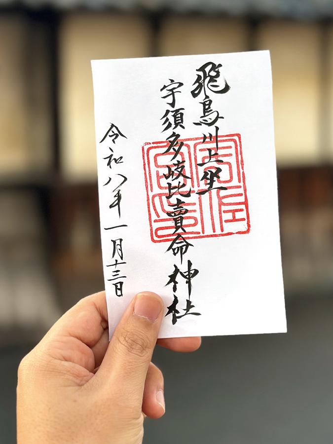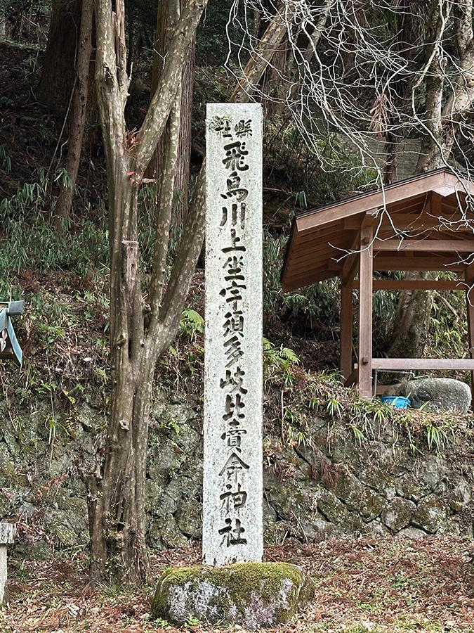 明日香村の飛鳥川上流域に鎮座する「飛鳥川上坐宇須多伎比売命神社(あすかかわかみにいますうすたきひめのみことじんじゃ)」は、日本一名前が長いことで知られる神社。背後の南淵山をご神体とし、平安時代の『延喜式』にも記される古社で、川沿いの県道から約200段の石段を登った先に拝殿があります。