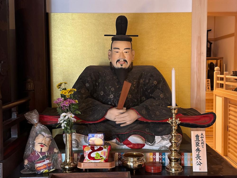 秀長に関連するものでは、位牌のほか1788年に描かれた肖像画や、秀長が定めた自治制度「箱本」に関わる史料が伝わり、1989年に奉納された秀長の木像も安置されています。肖像画は複製品が堂内に展示されています。