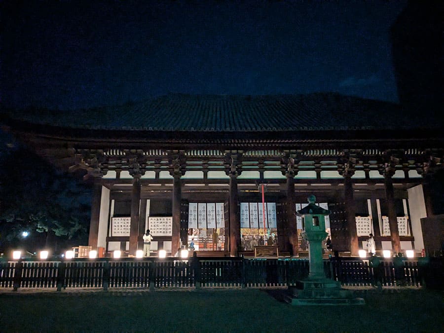 世界遺産社寺周遊バスで移動した興福寺では、国宝・東金堂の本尊・薬師如来坐像を筆頭に、その脇侍の日光・月光菩薩立像、四天王や十二神将立像などの前でじっと立ち止まって過ごす方々や、境内から灯りの漏れる東金堂のシルエットをスマホカメラに収める方々が多く見受けられました。