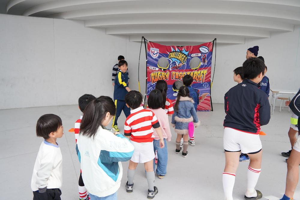 また、駅前広場のコフフンではラグビーの体験イベントも開かれ、参加した子どもたちはラグビーボールを手に、ターゲットの穴に投げ入れるミニゲームに挑戦しました。