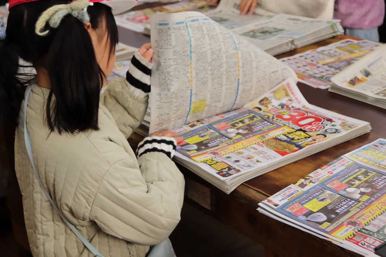 チラシを2つ折りにする専用の機械に通してから、折られたチラシを新聞に挟んでいきます。みな真剣なまなざしで、集中して体験しました。