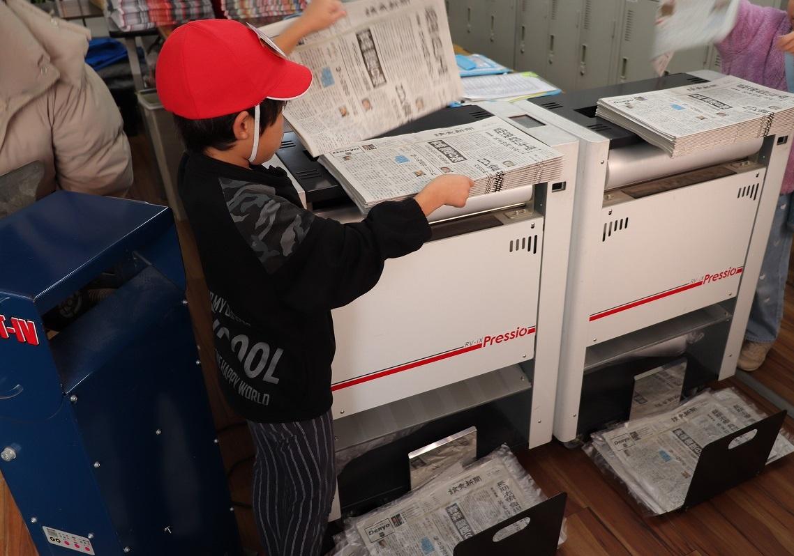 続いて、雨の日にも新聞が濡れないようにする、袋詰め作業を行いました。新聞を一部ずつ専用の機械に通すと、一瞬にしてビニール袋に梱包される様子に、子どもたちはびっくり!?