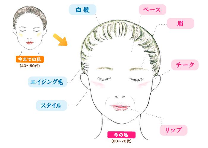 ピンク・ベージュ・ブロンド系のヘアカラーで白髪も楽しみましょう。個々の肌色に合った色味でトーンアップすれば印象が変わります。眉はイメージアップの大事なポイント。加齢とともに変わる目元もメイク次第ですよ♪