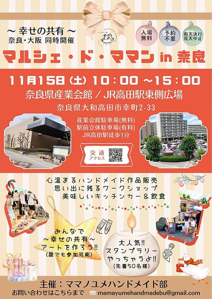 屋外イベント 参加型イベント ワークショップ 〈大和高田市〉ハンドメイド作品で幸せの共有を『マルシェ・ド・ママン』(11/15) 2025年11月15日(土) 奈良県産業会館/JR高田駅東側広場(大和高田市)