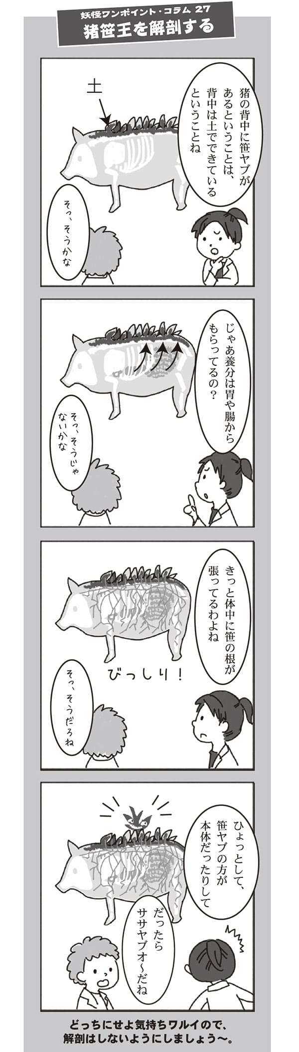 背中一面に熊笹を生やした巨大な猪笹王の伝説は広く知られていて、書店で売られている「妖怪図鑑」のような本にも、猪笹王がイラスト入りで掲載されています。このコーナーには、親友のなんばきびの猪笹王を掲載しました。ごゆっくりご覧ください。