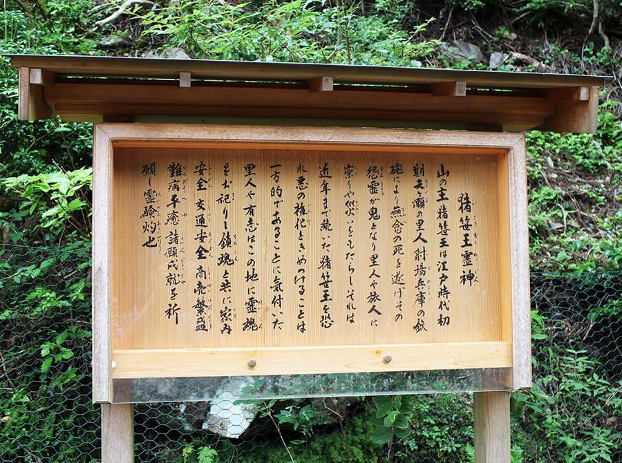 でも興味をひいたのは、その祟りや災いが「近年まで続いた」と書いてあることです。それでこの霊廟がいつできたのかというと、鳥居に「平成25年」とありました。「そうかあ、4年ほど前まで祟りがあったんだあ」と思いつつ続きを読むと、「猪笹王を恐れ、悪の権化と決めつけることは一方的であることに気づいた里人や有志は、この地に霊魂をお祀りし、鎮魂と共に家内安全、交通安全、商売繁盛、難病平癒、緒願成就を祈願し、霊験灼か成」とあります。