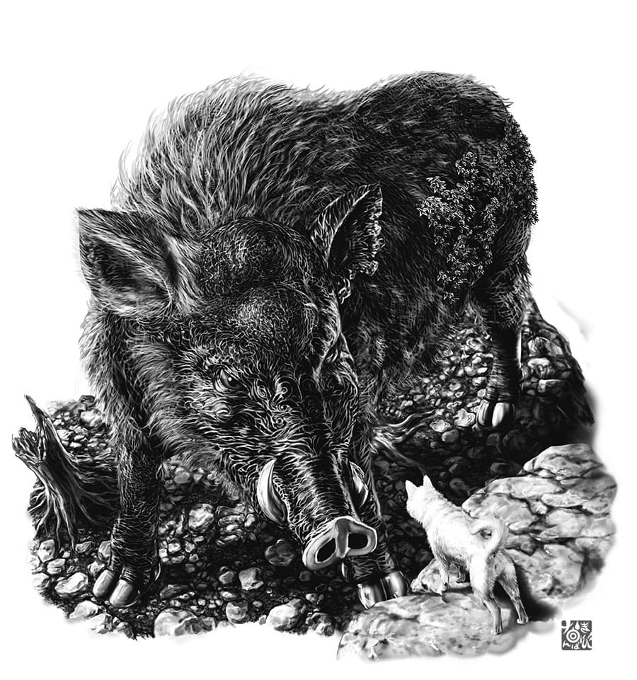 兵庫は狙いを定めて1発撃ち込みましたが、猪はひるむことなく兵庫と犬にうなりをあげて向かってきます。兵庫は2発、3発と撃ち込んでついに猪を倒しました。